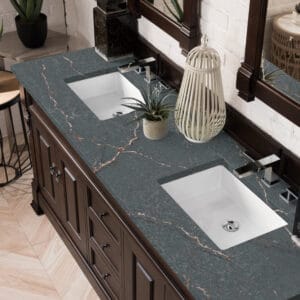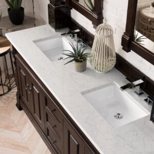 Heirloom-inspired, the Brookfield 72” Double vanity in Burnished Mahogany, by James Martin Vanities, showcases hand-carved detailing and raised panel doors. Two doors open to shelves for storage below, a sophisticated vanity solution for your bathroom.