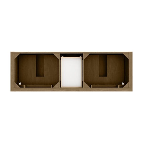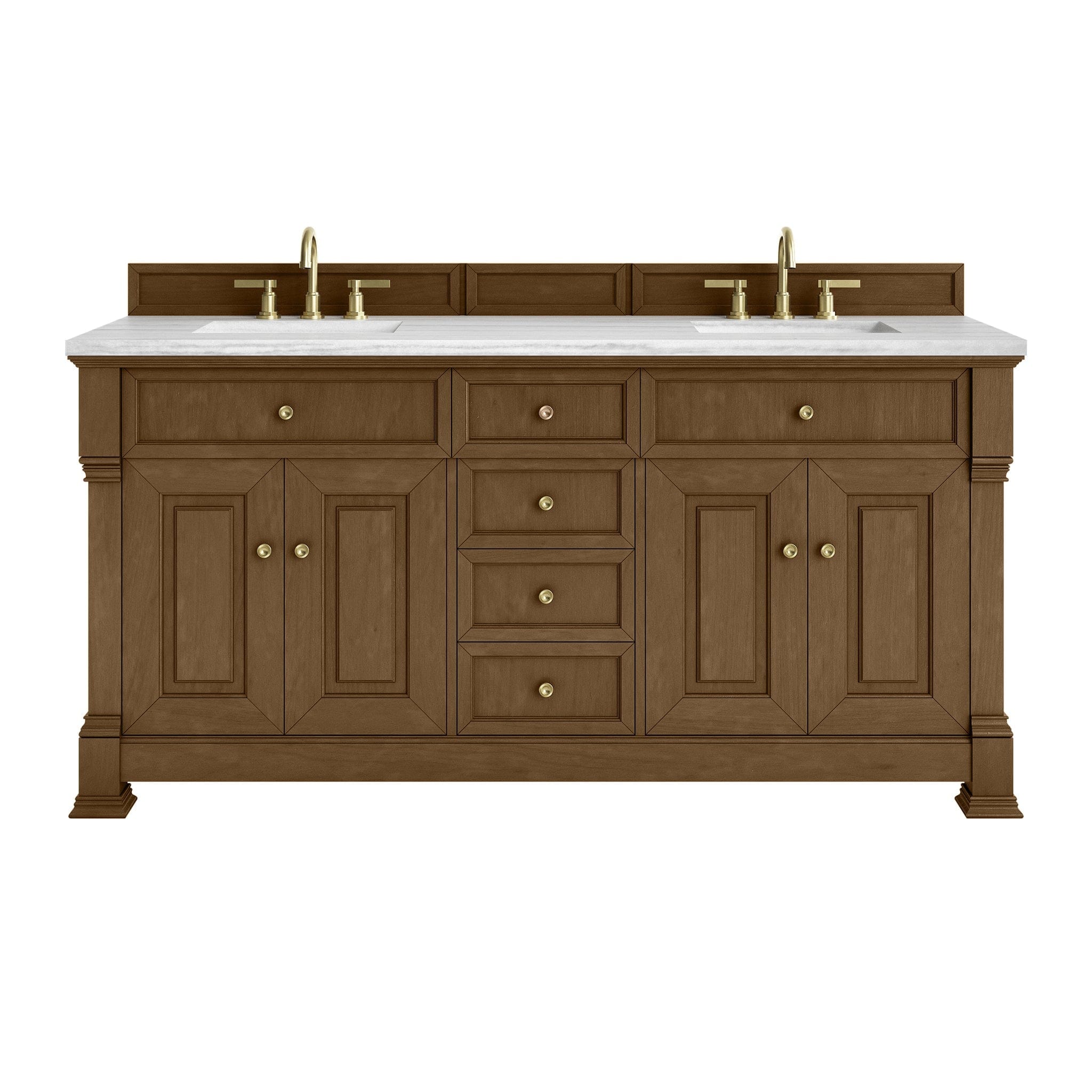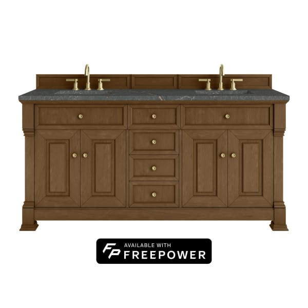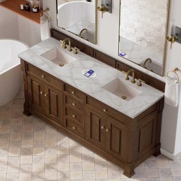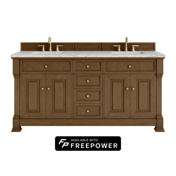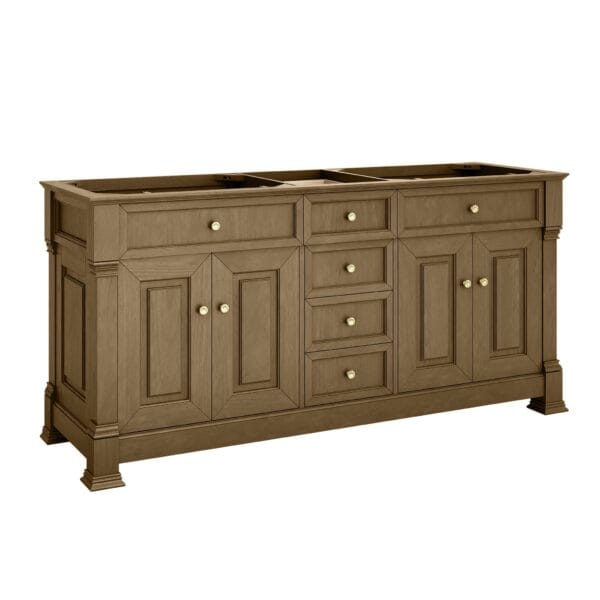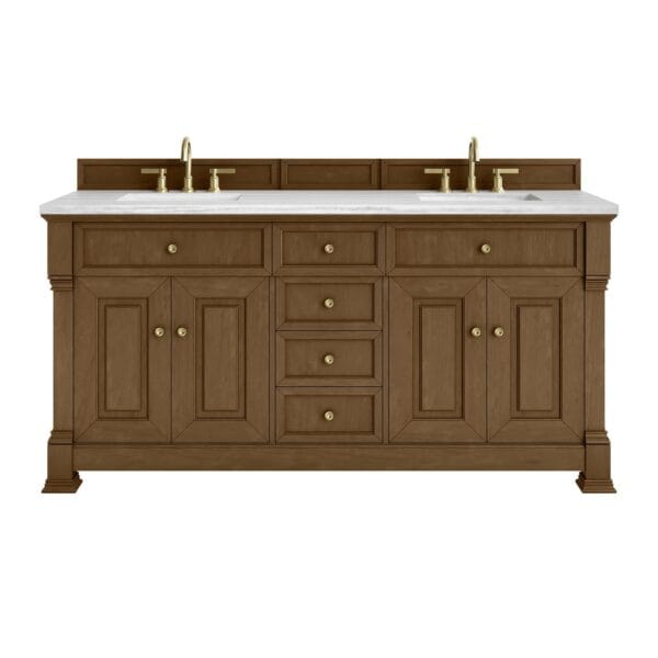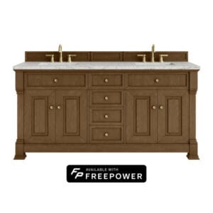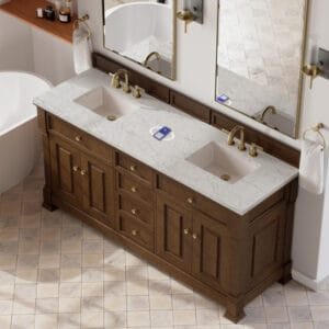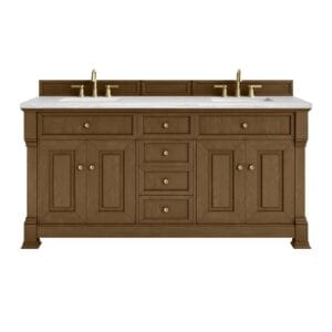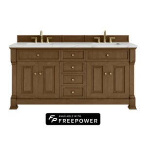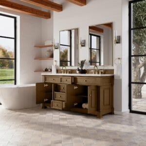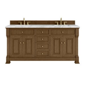 The Brookfield 72″ Double Vanity in Honey Oak by James Martin Vanities offers a blend of traditional elegance and contemporary sophistication. The raised panel picture frame doors and detailed corner molding reflect timeless craftsmanship, while the Honey Oak vanity finish and Champagne Brass hardware lend a fresh, modern appeal.