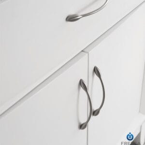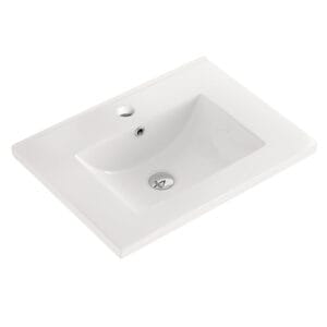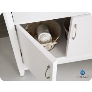 With its unique bow front design and beveled frame, this transitional White bathroom vanity makes a sophisticated style statement in any home. It features an integrated ceramic sink and countertop with clean lines and a thick profile. The modern white basin is equipped with an overflow, and has a single hole faucet mount.