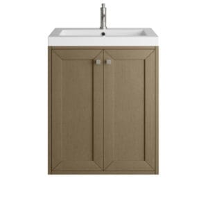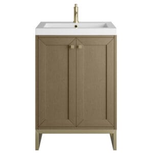 The Chianti 24-in. Vanity by James Martin Vanities is a classic shape that is topped with a rectangular solid surface top that gives it a transitional style. The body of the product is crafted from solid hardwood in a Walnut Whisper finish, which gives the piece a clean, crisp look. It’s a Perfect Vanity for your small bathroom.