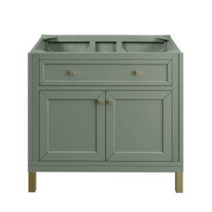The sophisticated details and clean lines of the Chicago 36″ Single Vanity by James Martin Vanities make it the perfect choice for any bathroom. Featuring a Smokey Celadon finish, this vanity offers ample storage with its two-door cabinet, adjustable interior shelf, and top-row tip-out drawer. Champagne Brass knobs and legs add a contemporary touch; or choose to forego the metal legs for a modern wall-mounted installation. Complete the look with one of our 3 cm tops.