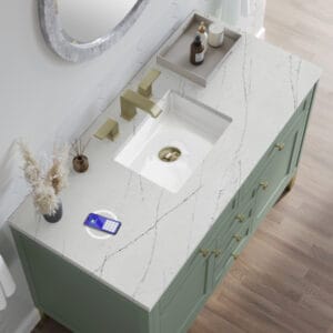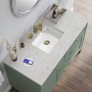 The sophisticated details and clean lines of the Chicago 48″ Single Vanity by James Martin Vanities make it the perfect choice for any bathroom. Featuring a Smokey Celadon finish, this vanity offers ample storage with its two single-door cabinets, adjustable interior shelves, and four drawers (three standard; one double-deep). Champagne Brass knobs and legs add a contemporary touch; or choose to forego the metal legs for a modern wall-mounted installation. Complete the look with one of our 3 cm tops.