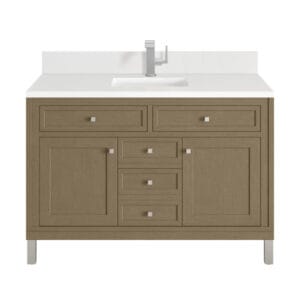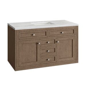 The sophisticated details and clean lines of the Chicago 48″ Single Vanity by James Martin Vanities make it the perfect choice for any bathroom. Featuring a Walnut Whisper finish, this vanity offers ample storage with its two single-door cabinets, adjustable interior shelves, and four drawers (three standard; one double-deep). Brushed Nickel knobs and legs add a contemporary touch; or choose to forego the metal legs for a modern wall-mounted installation. Complete the look with one of our 3 cm tops.