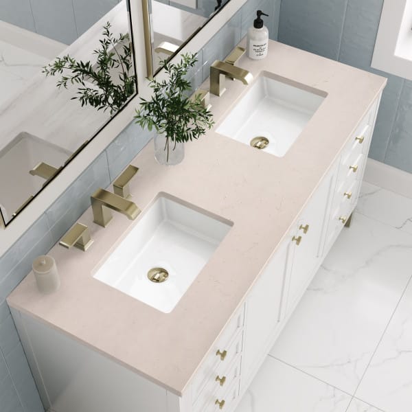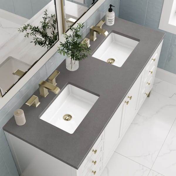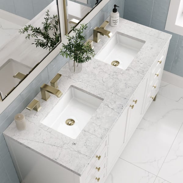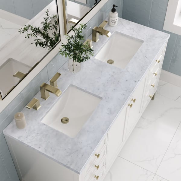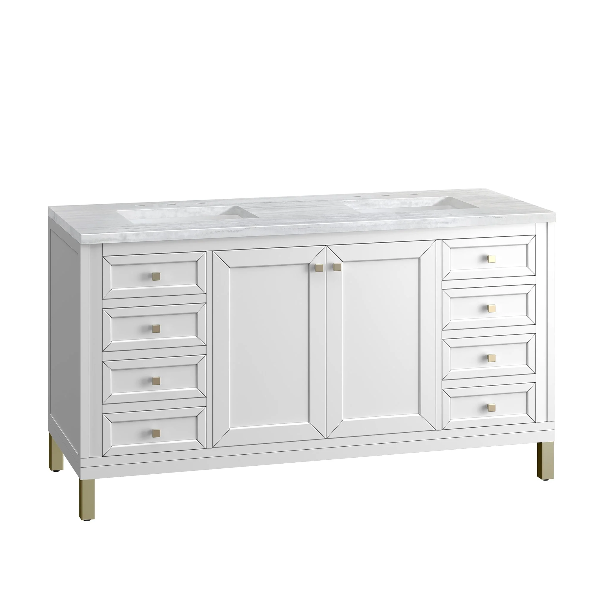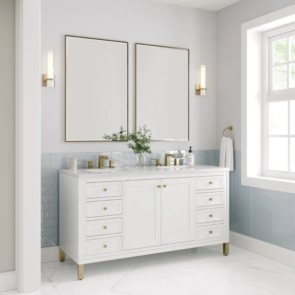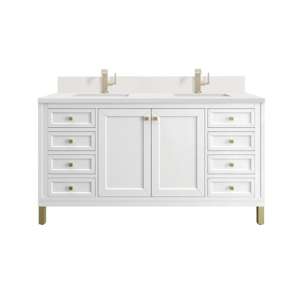 The sophisticated details and clean lines of the Chicago 60″ Double Vanity by James Martin Vanities make it the perfect choice for any bathroom. Featuring a Glossy White finish, this vanity offers ample storage with its double-door cabinets, adjustable interior shelves, and six drawers (two tip-outs, two standard, two double-deep). Champagne Brass knobs and legs add a contemporary touch; or choose to forego the metal legs for a modern wall-mounted installation. Complete the look with one of our 3 cm tops.