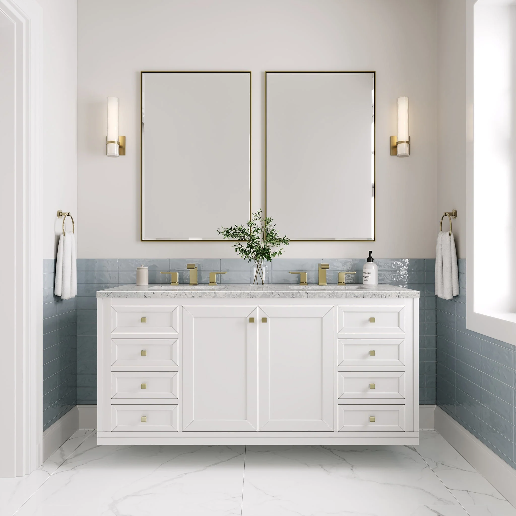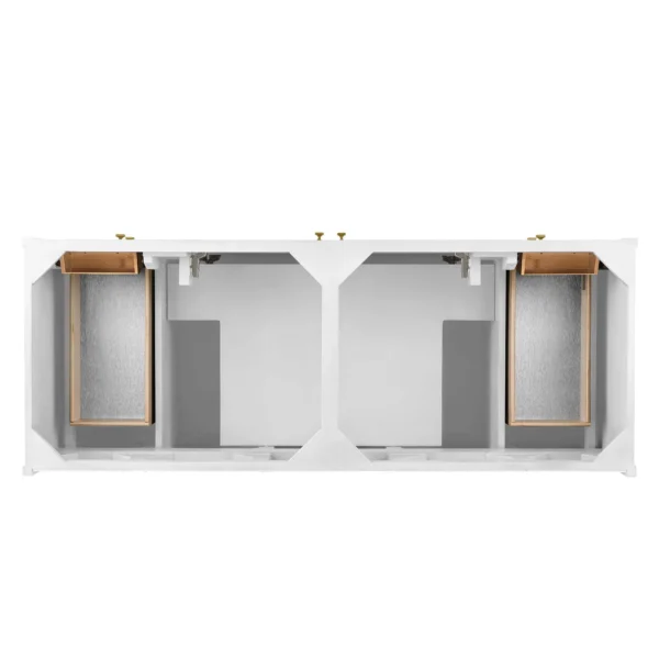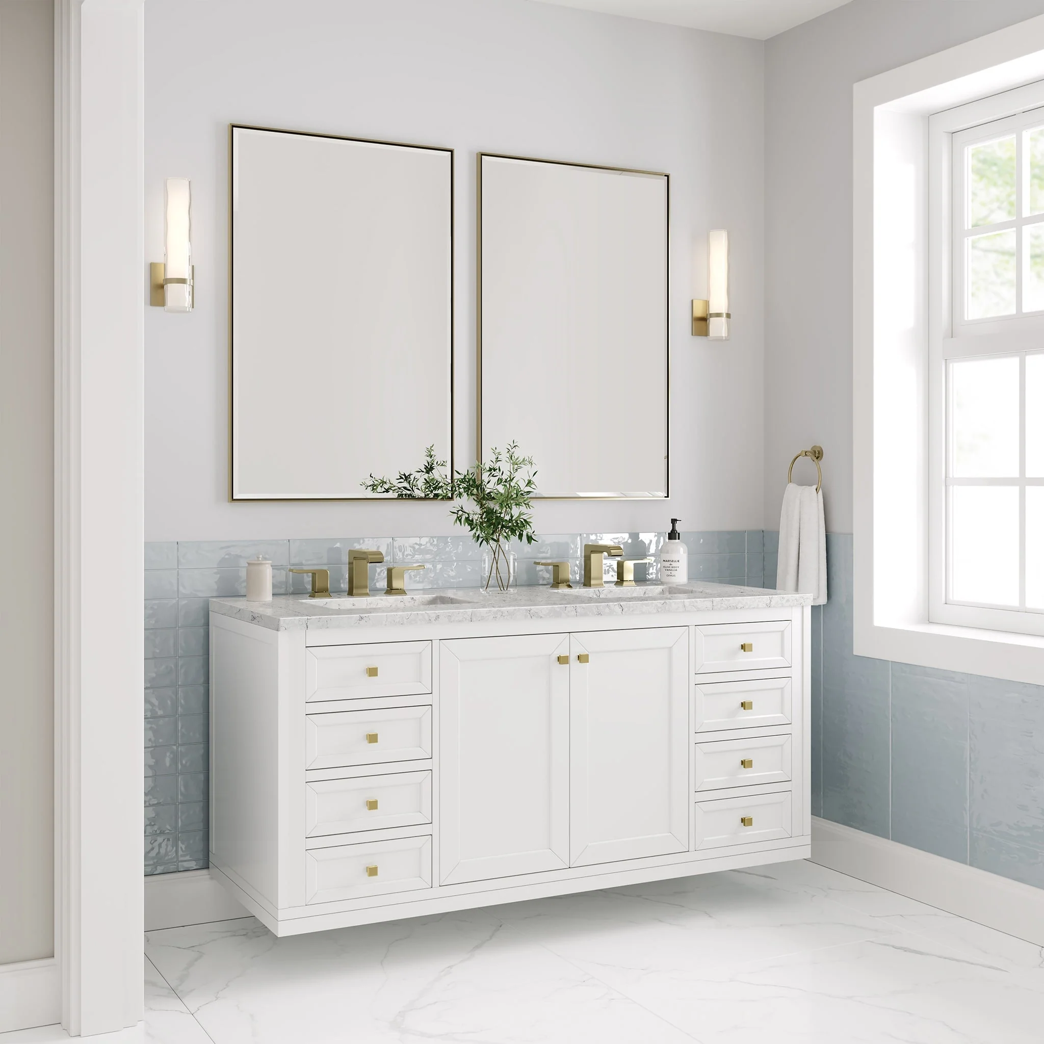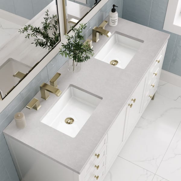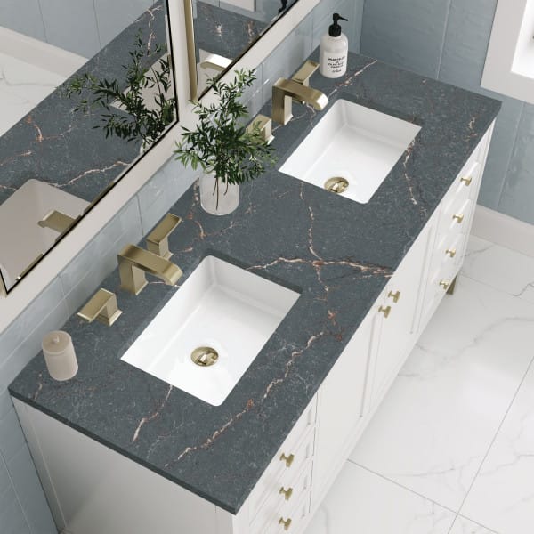 The sophisticated details and clean lines of the Chicago 60″ Double Vanity by James Martin Vanities make it the perfect choice for any bathroom. Featuring a Glossy White finish, this vanity offers ample storage with its double-door cabinets, adjustable interior shelves, and six drawers (two tip-outs, two standard, two double-deep). Champagne Brass knobs and legs add a contemporary touch; or choose to forego the metal legs for a modern wall-mounted installation. Complete the look with one of our 3 cm tops.