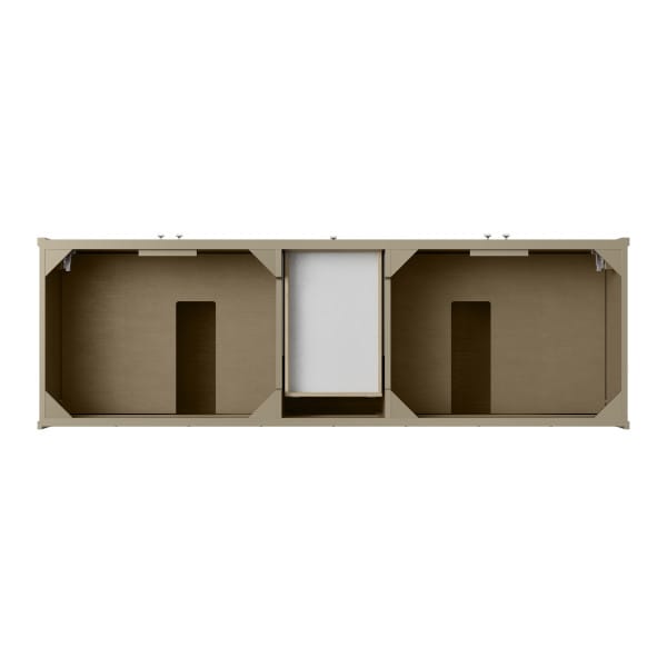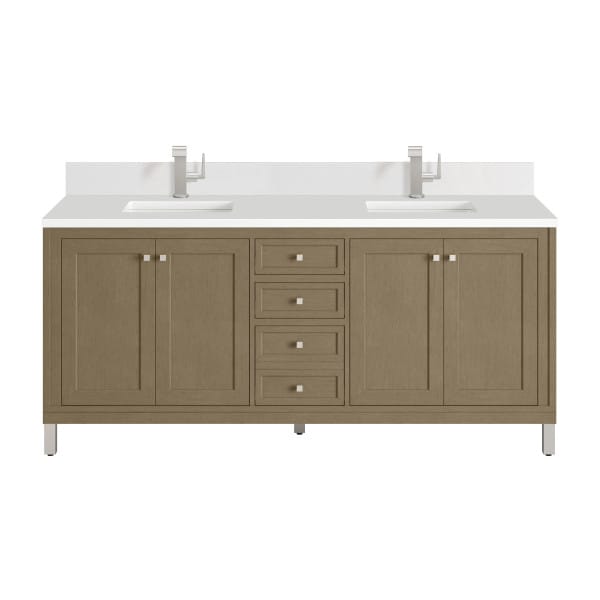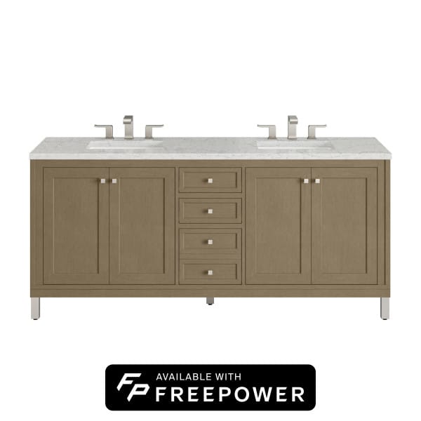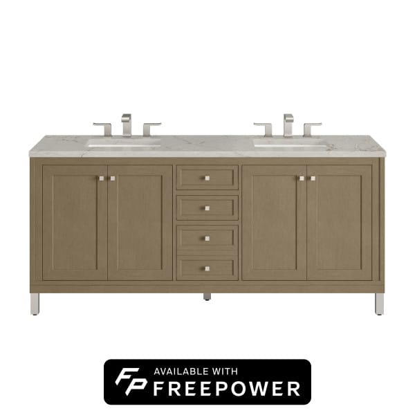 The sophisticated details and clean lines of the Chicago 72″ Double Vanity by James Martin Vanities make it the perfect choice for any bathroom. Featuring a Walnut Whisper finish, this vanity offers ample storage with its two double-door cabinets, adjustable interior shelves, and three drawers (two standard; one double-deep). Brushed Nickel knobs and legs add a contemporary touch; or choose to forego the metal legs for a modern wall-mounted installation. Complete the look with one of our 3 cm tops.