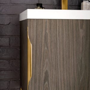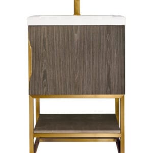 Add a fresh, contemporary touch to your bathroom with the elegant 24-in Columbia Single Vanity by James Martin Vanities. Comes with one soft-closing cabinet door in an Ash Gray finish, this stylish bathroom cabinet features clean lines and a simple sculpted base with tons of storage in a Radiant Gold finish. The door opens to an under-sink storage space with one adjustable shelf that will allow you to store your bathroom essentials. The beautiful Radiant Gold hardware is included, giving this cabinet the perfect finishing touch. Each cabinet is finished inside and out, with a premium undercoat finish for superior moisture and UV resistant. This versatile cabinet comes with an integrated glossy white solid surface top that is predrilled for your convenience.