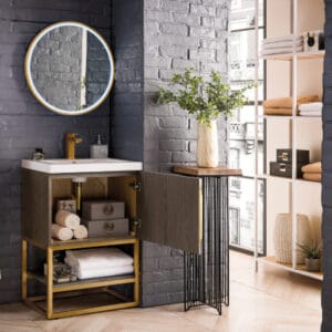 Add a fresh, contemporary touch to your bathroom with the elegant 24-in Columbia Single Vanity by James Martin Vanities. Comes with one soft-closing cabinet door in an Ash Gray finish, this stylish bathroom cabinet features clean lines and a simple sculpted base with tons of storage in a Radiant Gold finish.