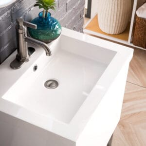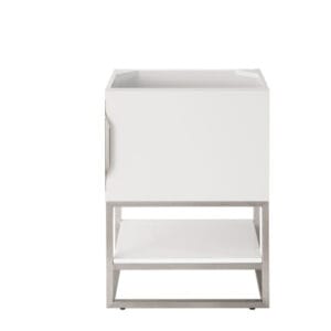 Add a fresh, contemporary touch to your bathroom with the elegant 24-in Columbia Single Vanity by James Martin Vanities. Comes with one soft-closing cabinet door in acrisp Glossy White finish, this stylish bathroom cabinet features clean lines and a simple sculpted base with tons of storage in a Brushed Nickel finish. The door opens to an under-sink storage space with one adjustable shelf that will allow you to store your bathroom essentials. The beautiful Brushed Nickel hardware is included, giving this cabinet the perfect finishing touch. Each cabinet is finished inside and out, with a premium undercoat finish for superior moisture and UV resistant. This versatile cabinet comes with an integrated glossy white solid surface top that is predrilled for your convenience.