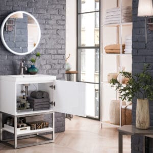 Add a fresh, contemporary touch to your bathroom with the elegant 24-in Columbia Single Vanity by James Martin Vanities. Comes with one soft-closing cabinet door in acrisp Glossy White finish, this stylish bathroom cabinet features clean lines and a simple sculpted base with tons of storage in a Brushed Nickel finish.