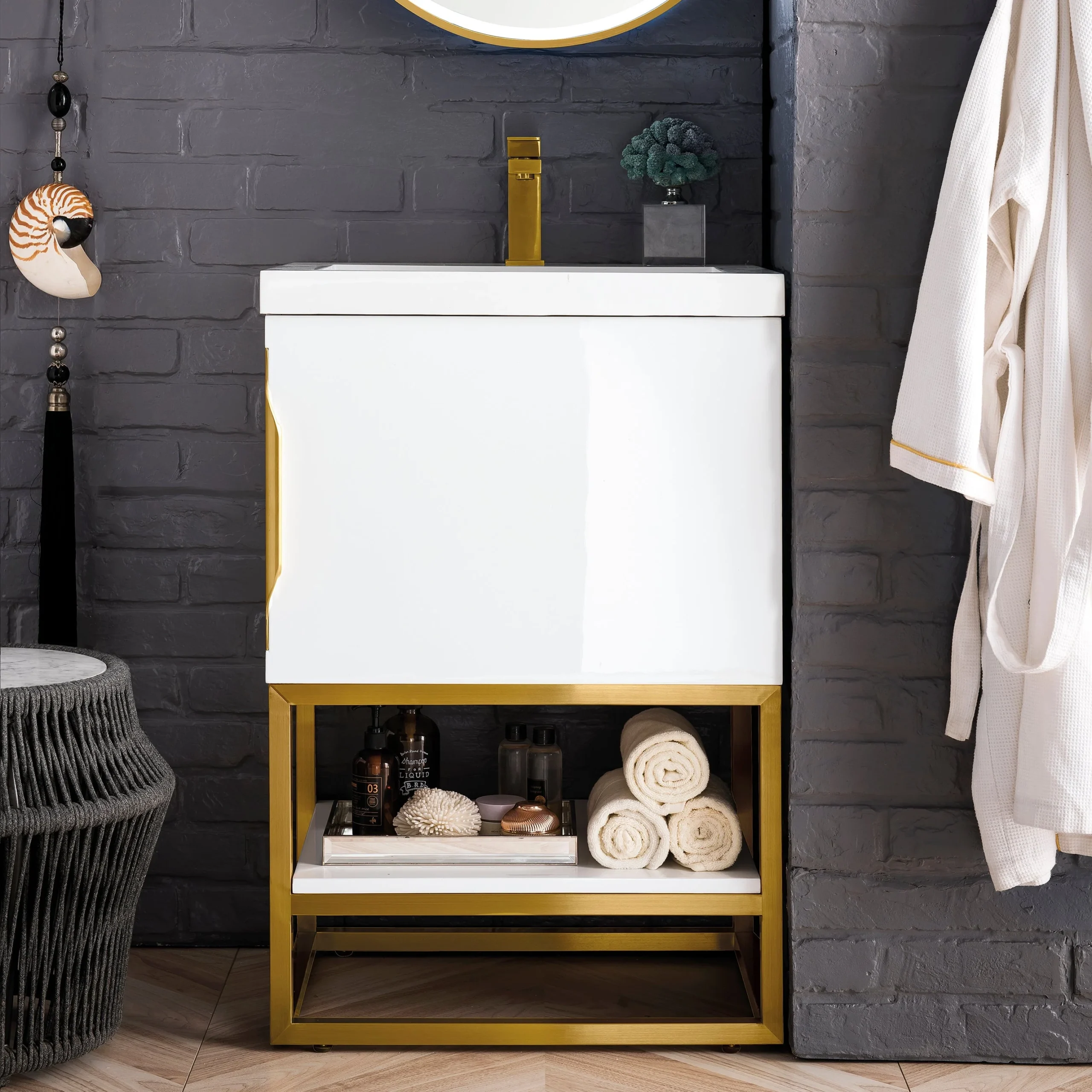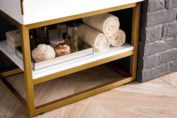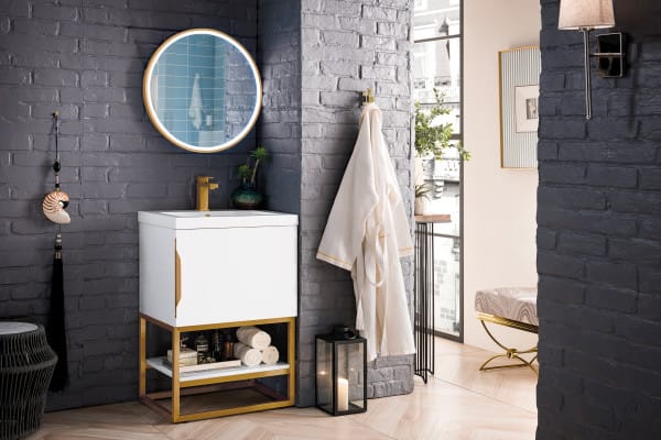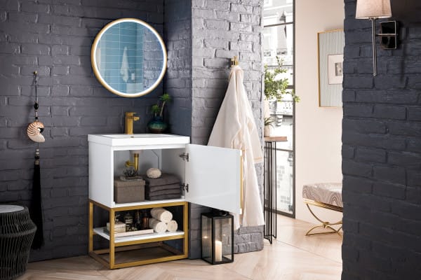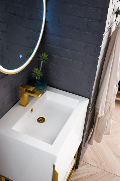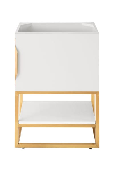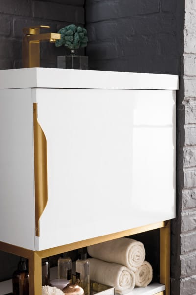 Add a fresh, contemporary touch to your bathroom with the elegant 24-in Columbia Single Vanity by James Martin Vanities. Comes with one soft-closing cabinet door in a crisp Glossy White finish, this stylish bathroom cabinet features clean lines and a simple sculpted base with tons of storage in a Radiant Gold finish. The door opens to an under-sink storage space with one adjustable shelf that will allow you to store your bathroom essentials. The beautiful Matte Black hardware is included, giving this cabinet the perfect finishing touch. Each cabinet is finished inside and out, with a premium undercoat finish for superior moisture and UV resistant. This versatile cabinet comes with an integrated glossy white solid surface top that is predrilled for your convenience.