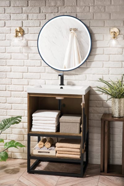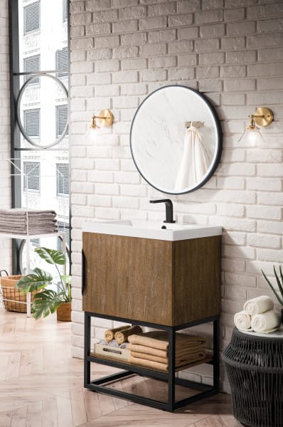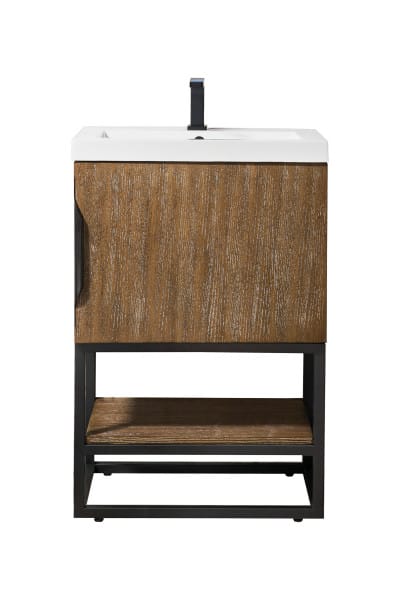Add a fresh, contemporary touch to your bathroom with the elegant 24-in Columbia Single Vanity by James Martin Vanities. Comes with one soft-closing cabinet door in a Latte Oak finish, this stylish bathroom cabinet features clean lines and a simple sculpted base with tons of storage in a Matte Black finish.
