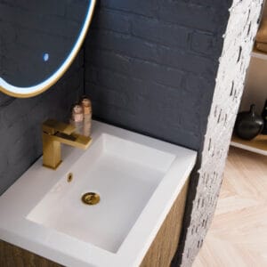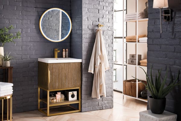 Columbia 24″ Single Vanity Cabinet in Latte Oak with Radiant Gold Base