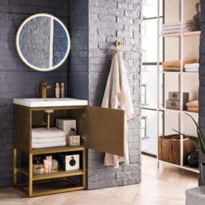 Add a fresh, contemporary touch to your bathroom with the elegant 31.5-in Columbia Single Vanity by James Martin Vanities. Comes with two soft-closing cabinet doors in a beautiful Latte Oak finish, this stylish bathroom cabinet features clean lines and a simple sculpted base with tons of storage in a Radiant Gold finish.