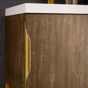 Add a fresh, contemporary touch to your bathroom with the elegant 31.5-in Columbia Single Vanity by James Martin Vanities. Comes with two soft-closing cabinet doors in a beautiful Latte Oak finish, this stylish bathroom cabinet features clean lines and a simple sculpted base with tons of storage in a Radiant Gold finish. The door opens to an under-sink storage space with one adjustable shelf that will allow you to store your bathroom essentials. The beautiful Radiant Goldhardware is included, giving this cabinet the perfect finishing touch. Each cabinet is finished inside and out, with a premium undercoat finish for superior moisture and UV resistant. This versatile cabinet comes with an integrated glossy white composite top that is predrilled for your convenience.