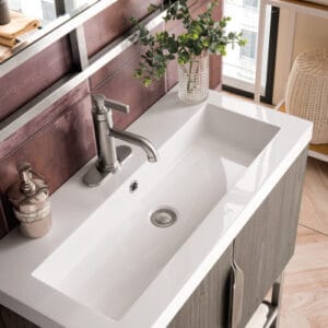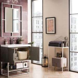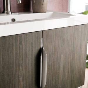 Add a fresh, contemporary touch to your bathroom with the elegant 31.5-in Columbia Single Vanity by James Martin Vanities. Comes with two soft-closing cabinet doors in a beautiful Ash Gray finish, this stylish bathroom cabinet features clean lines and a simple sculpted base with tons of storage in a Brushed Nickel finish.