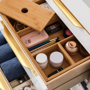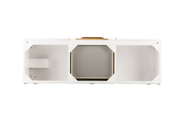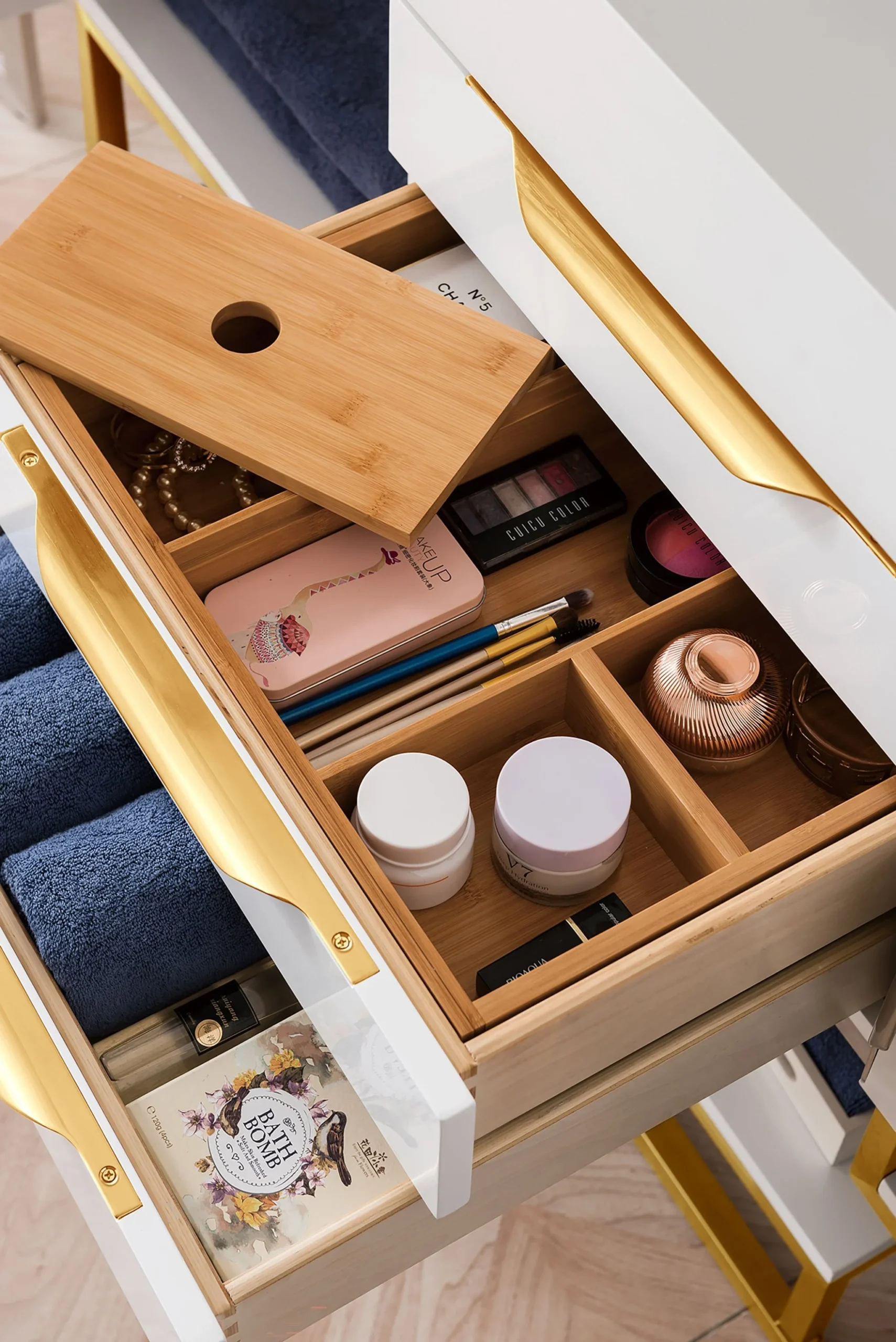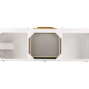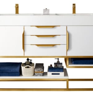 The Columbia 59″ double vanity in Glossy White, by James Martin Vanities, offers maximum storage with two soft-closing doors, three soft-closing drawers, and lower shelf space. The stainless steel metal base is coated in a Radiant Gold finish, or choose to wall-mount this vanity for a chic, floating look.
