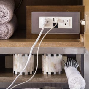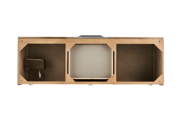The Columbia 59″ double vanity in Latte Oak, by James Martin Vanities, offers maximum storage with two soft-closing doors, three soft-closing drawers, and lower shelf space. The stainless steel metal base is coated in a Brushed Nickel finish, or choose to wall-mount this vanity for a chic, floating look. This cabinet comes with premium features such as one solid bamboo in-drawer organizer and one 120 Volt UL rated electrical component with two electrical and two USB (2.0) outlets. Glossy White composite countertop with integrated sink included.