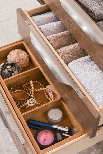 - Brushed aluminum laminate drawer bottoms