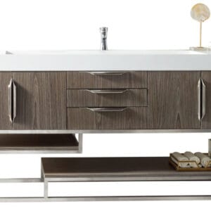 The Columbia 72″ Ash Gray vanity offers maximum storage with two soft-closing doors, three soft-closing drawers, and lower shelf space. This cabinet comes with premium features such as one solid bamboo in-drawer organizer and one 120 Volt UL rated electrical component with two electrical and two USB (2.0) outlets. The Brushed Nickel finished base coordinates with the pulls. Glossy White composite countertop with integrated wide, angled trough style sink.