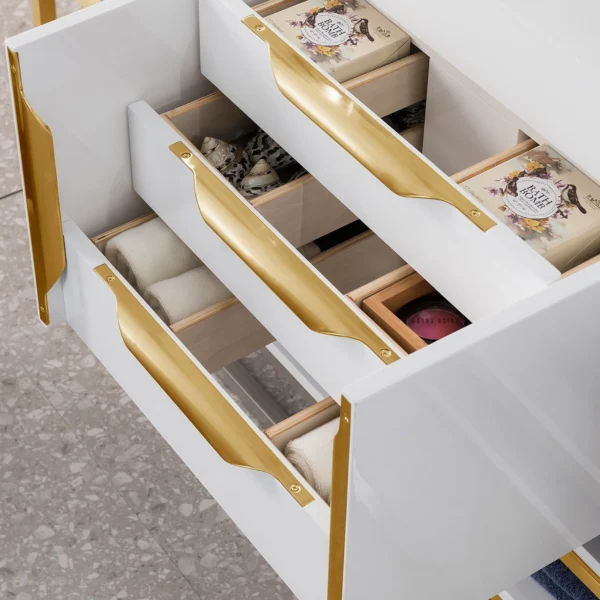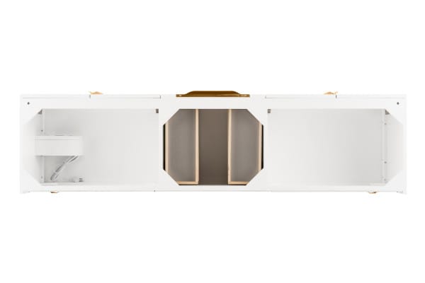The Columbia 72″ Glossy White vanity offers maximum storage with two soft-closing doors, three soft-closing drawers, and lower shelf space. This cabinet comes with premium features such as one solid bamboo in-drawer organizer and one 120 Volt UL rated electrical component with two electrical and two USB (2.0) outlets.