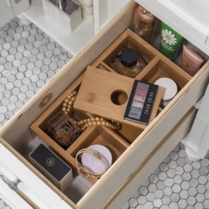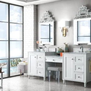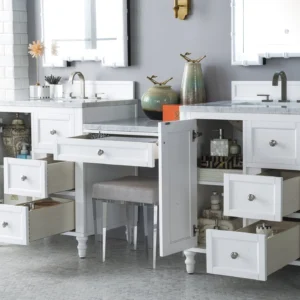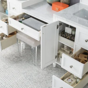 The Copper Cove Encore 86″ Bright White Double Vanity Set by James Martin Vanities features two 48″ cabinets connected by a matching 26″ make-up counter. The cabinet includes optional towel bars, a bamboo drawer organizer, an electrical outlet with two USB ports, and interior shelf space.