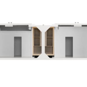 The De Soto 72″ Double Vanity was designed to fulfill a wide range of tasks. Storage and convenience are foremost in this collection, with storage behind the two sets of doors with interior shelf space, and within the three drawers. Premium features in this series include an electrical and USB outlet and beautiful faux-shagreen drawer organizers.