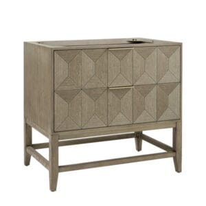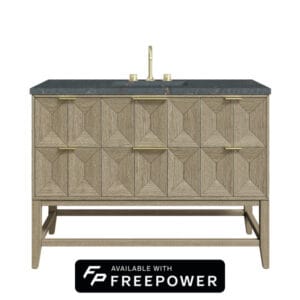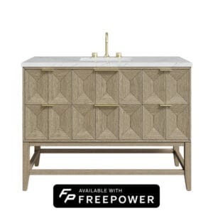Inspired by today’s modern furnishings, characterized by clean lines juxtaposed with unexpected artisan details, the 72″ Emmeline double vanity by James Martin Vanities creates a bold statement. A solid Ash wood base frame supports a faceted front vanity cabinet featuring five spacious drawers lined with a brushed aluminum laminate.