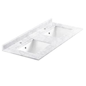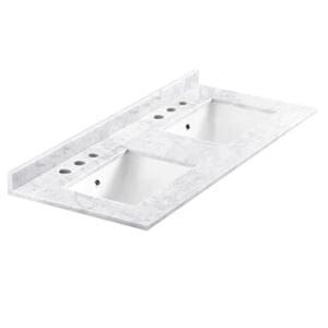 This Formosa Artisan Double Sink Bathroom Vanity has a warm grey finish with a hint of brown throughout, and a natural grain that will inject luxurious warmth into any space. Gracing the top of the vanity is a stunning 48” quartz stone countertop and two ceramic undermount basins. The white ceramic basins have a smooth, contoured design, while the gorgeous quartz stone countertop has clean, square edges. The basins are equipped with an overflow and the countertop has been pre-drilled to accommodate the faucet of your choice. P-trap, pop-up drain and installation hardware are included.