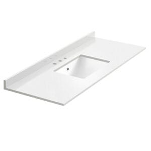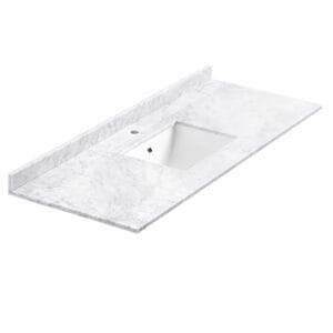 Gracing the top of the vanity is a stunning 54” quartz stone countertop and ceramic undermount basin. With ample counter space, this luxurious vanity makes the morning routine a pleasure. The white ceramic basin has a smooth, contoured design, while the gorgeous quartz stone countertop has clean, square edges. The basin is equipped with an overflow and the countertop has been pre-drilled to accommodate the faucet of your choice. A p-trap, pop-up drain and installation hardware are included.