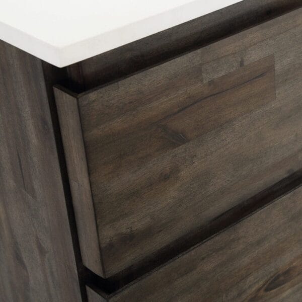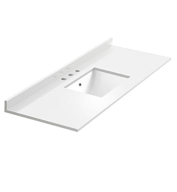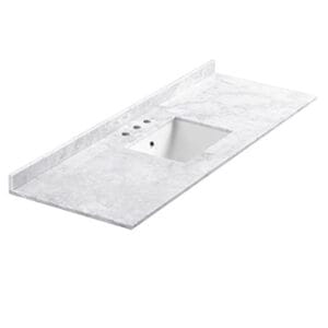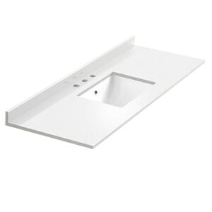 Gracing the top of the vanity is a stunning 60” quartz stone countertop and ceramic undermount basin. With ample counter space, this luxurious vanity makes the morning routine a pleasure. The white ceramic basin has a smooth, contoured design, while the gorgeous quartz stone countertop has clean, square edges. The basin is equipped with an overflow and the countertop has been pre-drilled to accommodate the faucet of your choice. A p-trap, pop-up drain and installation hardware are included.