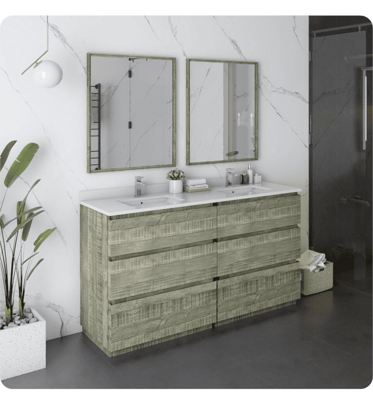 The Fresca Formosa Artisan Double Sink Bathroom Vanity brings luxury home. This superbly crafted vanity is solid Acacia wood, known for its magnificent beauty and durability. A masterpiece of elegance and style, this vanity is in a class by itself, offering a refined look and feel that complements an upscale lifestyle. The solid wood free-standing vanity has a bold shape and measures 60” in width. It adds grand style to any bathroom.