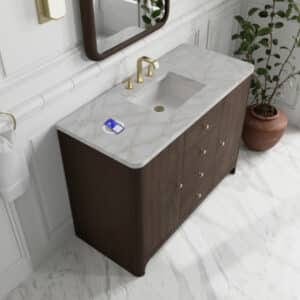 The Gracyn 48″ Single Vanity by James Martin Vanities is a tactile and visual delight, boasting soft curves and a rich Sable finish that brings character to your space. The sand-blasted finish on natural Ash gives textural and visual definition to the wood grain, truly bringing this piece to life.