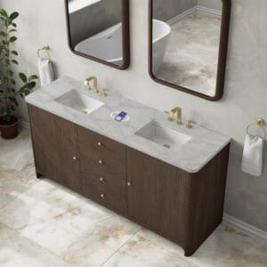 The Gracyn 72″ Double Vanity by James Martin Vanities is a tactile and visual delight, boasting soft curves and a rich Sable finish that brings character to your space. The sand-blasted finish on natural Ash gives textural and visual definition to the wood grain, truly bringing this piece to life.