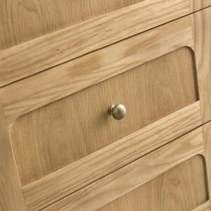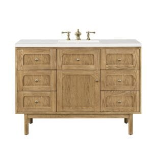 The 48″ Laurent Single Vanity features picture frame detailing with unexpected soft curves. The Light Natural Oak finish over cathedral grain Ash veneers creates modern rustic appeal. This vanity offers a top-row tip-out style drawer, six traditional drawers, and a removable bamboo storage tray.