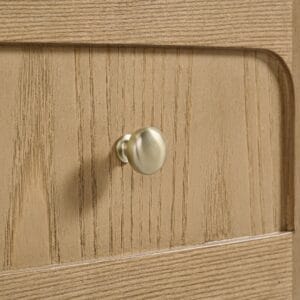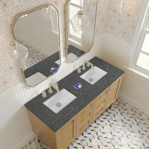 A modern interpretation of mid-century design, the Laurent 60″ Double Vanity by James Martin Vanities features organic charm with soft, rounded picture-frame details. Its Light Natural Oak finish over cathedral grain Ash veneers highlights the beautiful, natural wood texture, while Champagne Brass knobs lend a touch of elegance. Designed for versatility, this vanity offers two top-row tip-out drawers, four generously sized full-extension drawers, and a removable bamboo drawer organizer.