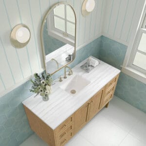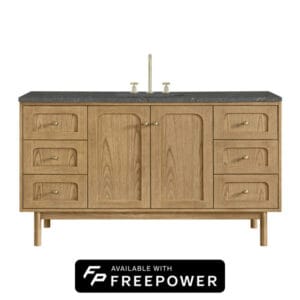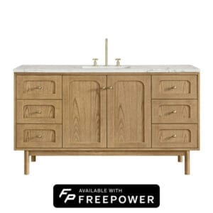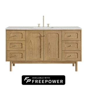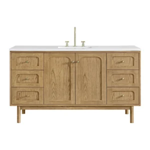 A modern interpretation of mid-century design, the Laurent 60″ Single Vanity by James Martin Vanities features organic charm with soft, rounded picture-frame details. Its Light Natural Oak finish over cathedral grain Ash veneers highlights the beautiful, natural wood texture, while Champagne Brass knobs lend a touch of elegance.