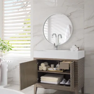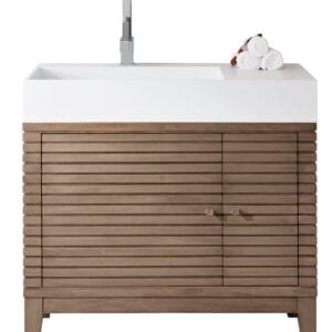 Inspired by the minimalism of Scandinavian style, the Linear 36″ single vanity by James Martin Vanities features an understated modern design highlighted by clean lines and Satin Nickel finish knobs. Inside are spacious storage options with two doors, one shelf, and one inside drawer. The recessed interior drawer is designed to only extend and open half way. A high-profile Glossy White composite stone sinktop completes the look.
