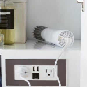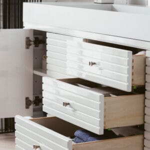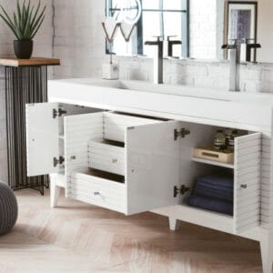 Inspired by the minimalism of Scandinavian style, the Linear 72″ double vanity by James Martin Vanities features an understated modern design highlighted by clean lines and Satin Nickel finish knobs. You’ll love the spacious storage options with four doors, two shelves, and three drawers, plus two electric and USB outlets for your convenience.
