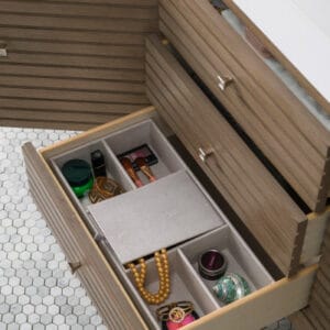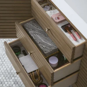 Inspired by the minimalism of Scandinavian style, the Linear 72″ double vanity by James Martin Vanities features an understated modern design highlighted by clean lines and Satin Nickel finish knobs. You’ll love the spacious storage options with four doors, two shelves, and three drawers, plus two electric and USB outlets for your convenience.