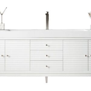 Inspired by the minimalism of Scandinavian style, the Linear 72″ single vanity by James Martin Vanities features an understated modern design highlighted by clean lines and Satin Nickel finish knobs. You’ll love the spacious storage options with four doors, two shelves, and three drawers, plus two electric and USB outlets for your convenience.