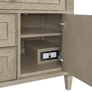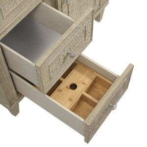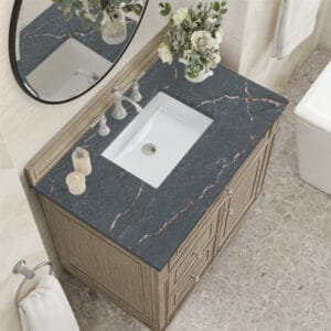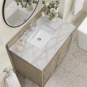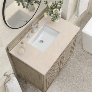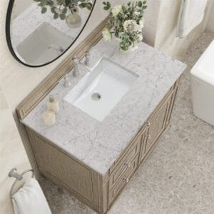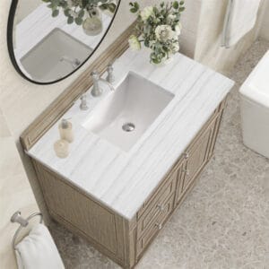 The 36″ Lorelai Single Vanity by James Martin Vanities celebrates timeless form and exquisite finish details, combined with practical function. The Whitewashed Oak finish is accented by reeded details, and clean, raised picture frame molding. Coin-edge knobs in Satin Nickel provide the perfect accent. iece.This single-door cabinet opens to a spacious interior with a single shelf and a convenient USB/Electric power outlet. Two drawers and an upper tip-out drawer offer additional storage space. Choose one of our 3 cm tops with undermount, rectangular sink to perfectly complete this masterpiece.