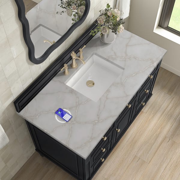The 48″ Lorelai Single Vanity by James Martin Vanities celebrates timeless form and exquisite finish details, combined with practical function. The rich Black Onyx finish is accented by coin-edge knobs in Champagne Brass which provides a sophisticated contrast. Reeded details, and clean, and raised picture frame molding lend visual interest. This single-door cabinet opens to a spacious interior with a single shelf and a convenient USB/Electric power outlet. Six drawers offer additional storage space. Choose one of our 3 cm tops with undermount, rectangular sinks to perfectly complete this masterpiece.