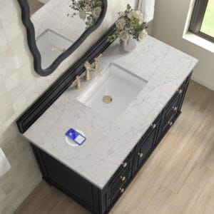 The 48″ Lorelai Single Vanity by James Martin Vanities celebrates timeless form and exquisite finish details, combined with practical function. The rich Black Onyx finish is accented by coin-edge knobs in Champagne Brass which provides a sophisticated contrast.