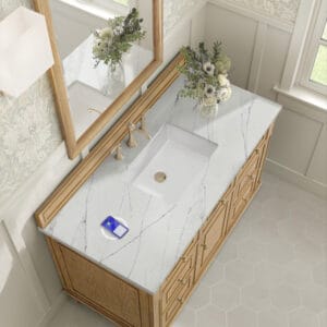 The 48″ Lorelai Single Vanity by James Martin Vanities celebrates timeless form and exquisite finish details, combined with practical function. The Light Natural Oak finish is accented by reeded details, and clean, raised picture frame molding. Coin-edge knobs in Champagne Brass provide the perfect accent.