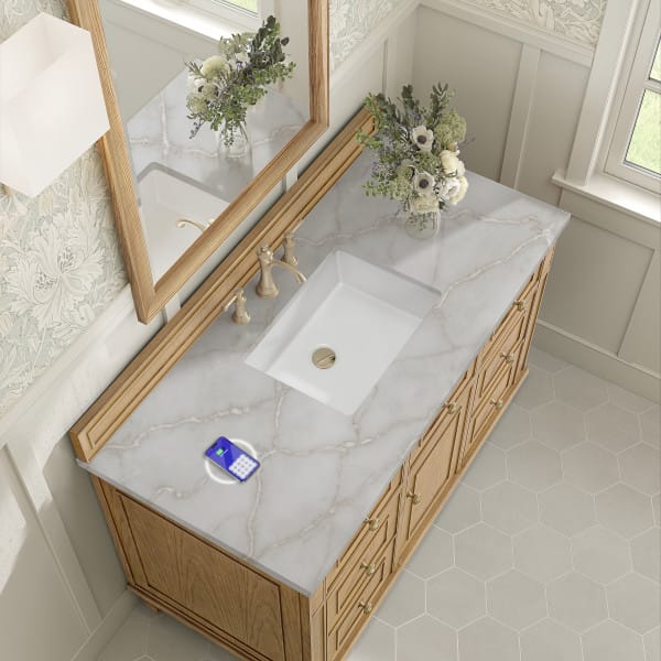 The 48″ Lorelai Single Vanity by James Martin Vanities celebrates timeless form and exquisite finish details, combined with practical function. The Light Natural Oak finish is accented by reeded details, and clean, raised picture frame molding. Coin-edge knobs in Champagne Brass provide the perfect accent. This single-door cabinet opens to a spacious interior with a single shelf and a convenient USB/Electric power outlet. Six drawers offer additional storage space. Choose one of our 3 cm tops with undermount, rectangular sinks to perfectly complete this masterpiece.