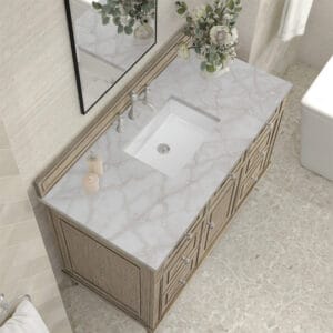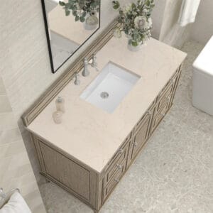 The 48″ Lorelai Single Vanity by James Martin Vanities celebrates timeless form and exquisite finish details, combined with practical function. The Whitewashed Oak finish is accented by reeded details, and clean, raised picture frame molding. Coin-edge knobs in Satin Nickel provide the perfect accent. This single-door cabinet opens to a spacious interior with a single shelf and a convenient USB/Electric power outlet. Six drawers offer additional storage space. Choose one of our 3 cm tops with undermount, rectangular sink to perfectly complete this masterpiece.