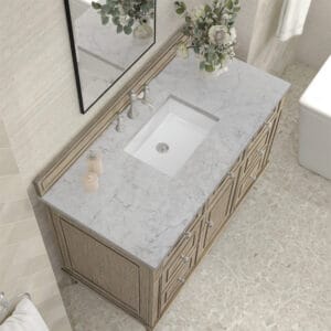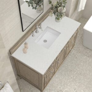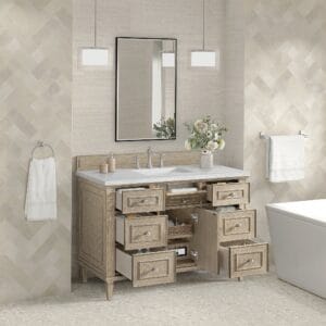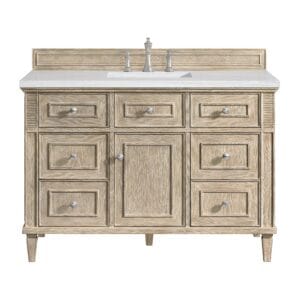 The 48″ Lorelai Single Vanity by James Martin Vanities celebrates timeless form and exquisite finish details, combined with practical function. The Whitewashed Oak finish is accented by reeded details, and clean, raised picture frame molding. Coin-edge knobs in Satin Nickel provide the perfect accent.