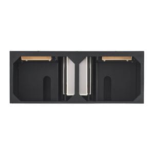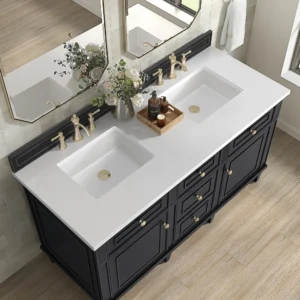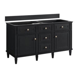 The 60″ Lorelai Double Vanity by James Martin Vanitiesby James Martin Vanities celebrates timeless form and exquisite finish details, combined with practical function. The rich Black Onyx finish is accented by coin-edge knobs in Champagne Brass which provides a sophisticated contrast. Reeded details, and clean, and raised picture frame molding lend visual interest.