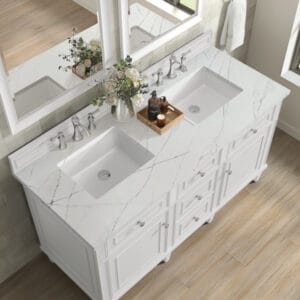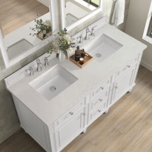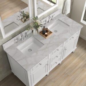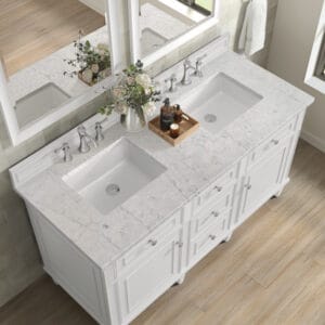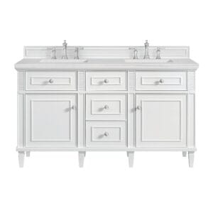 The 60″ Lorelai Double Vanity by James Martin Vanities celebrates timeless form and exquisite finish details, combined with practical function. The sophisticated Bright White finish is accented by reeded details, and clean, raised picture frame molding. Coin-edge knobs in Satin Nickel provide the perfect accent. This two-door cabinet opens to a spacious interior with shelves and convenient USB/Electric power outlets. 3 traditional drawers and 2 tip-outs offer additional storage space. Choose one of our 3 cm tops with undermount, rectangular sinks to perfectly complete this masterpiece.